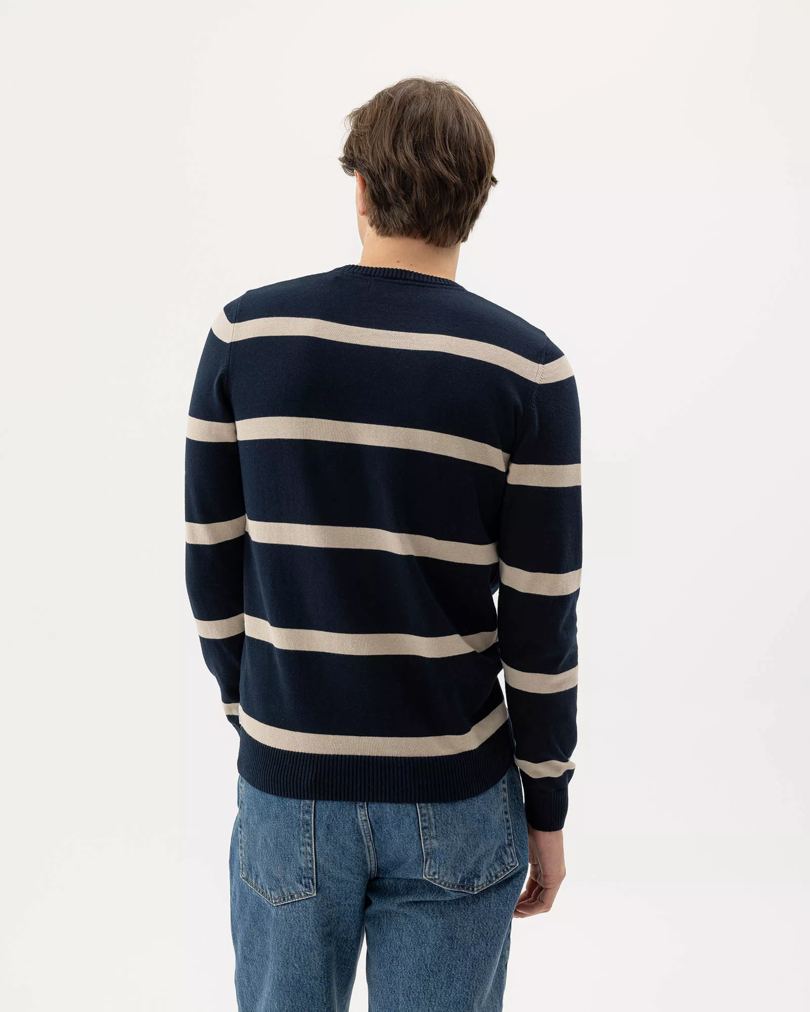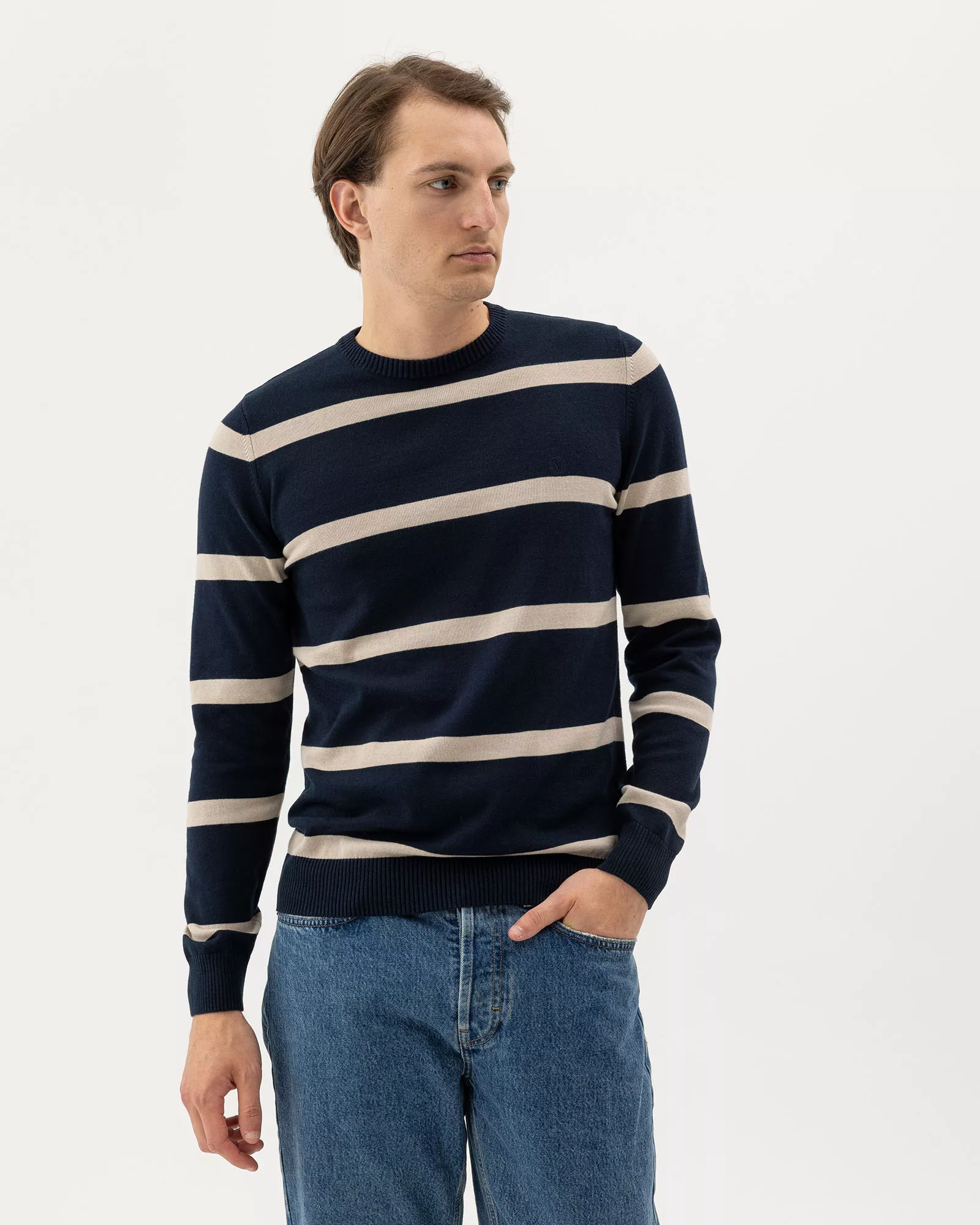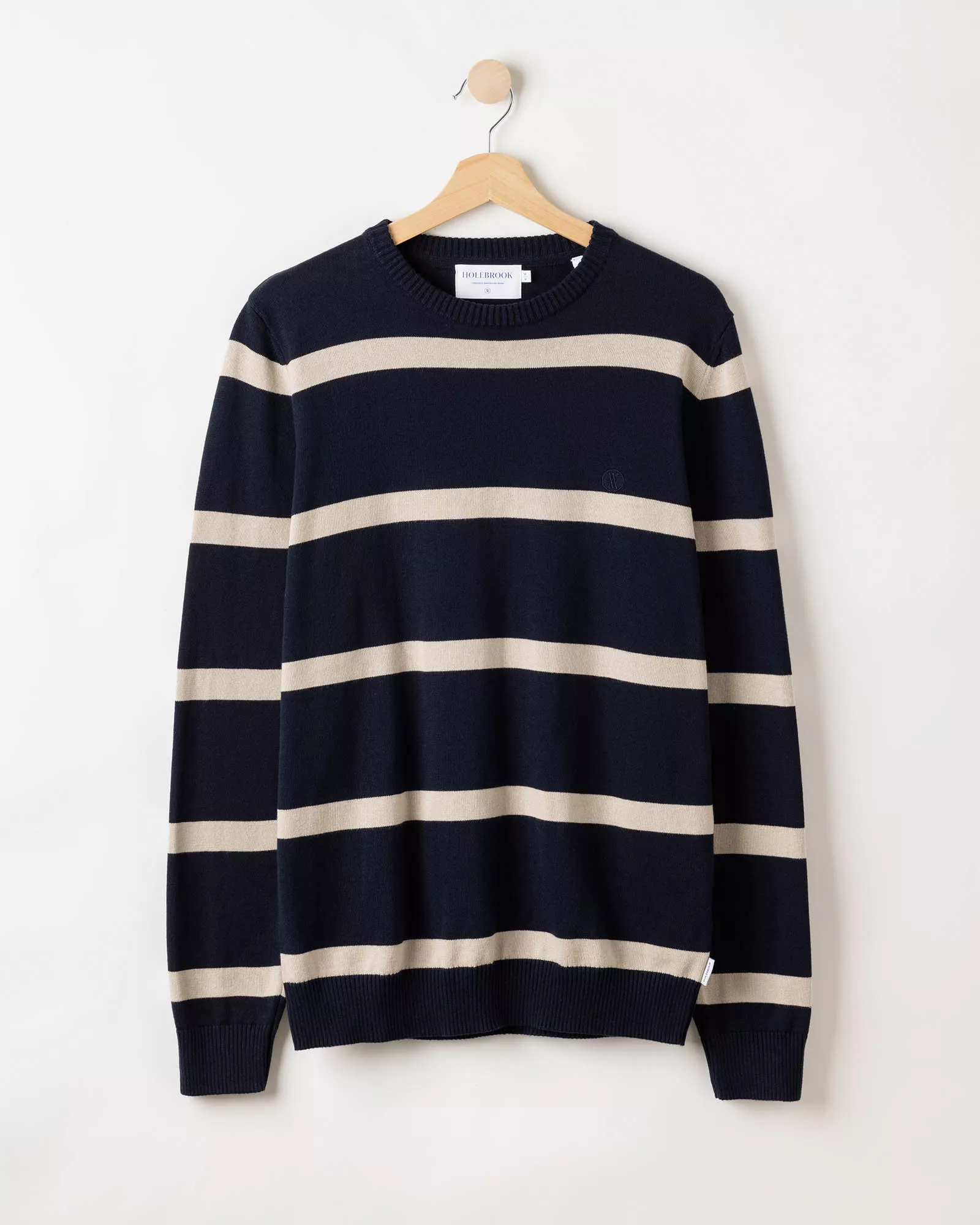 Finstickad tröja från Holebrook med rund hals i 100% ekologisk bomull. Ribbade avslut och normal passform. En användbar baströja som återkommer varje säsong. Hållbart producerad i Europa.