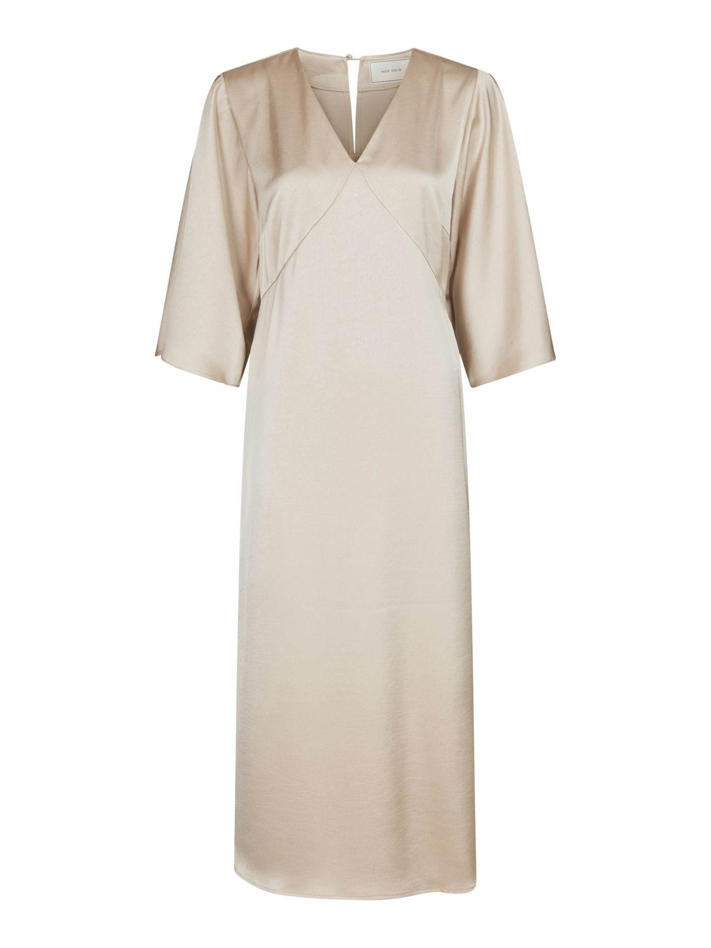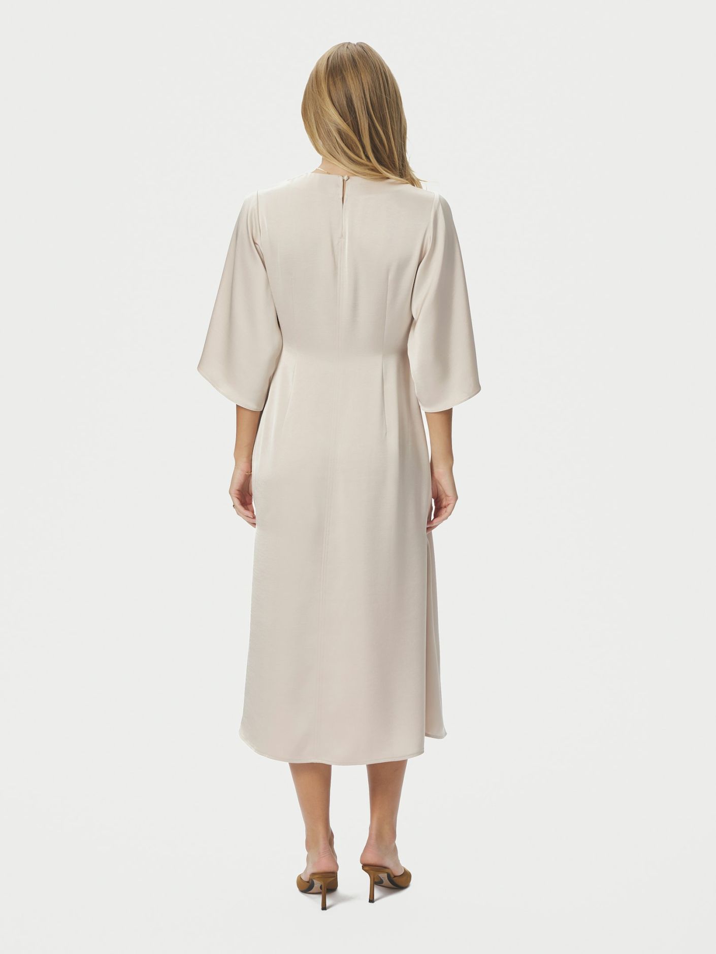 Kvinnlig klänning med v-ringning och lösa 3/4-ärmar. Ärmarna har en hög slits och klänningen stängs med en knapp vid halsen. Modellen är 176 cm och bär storlek 36.