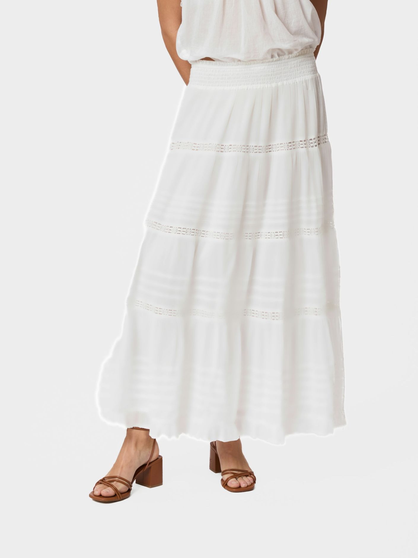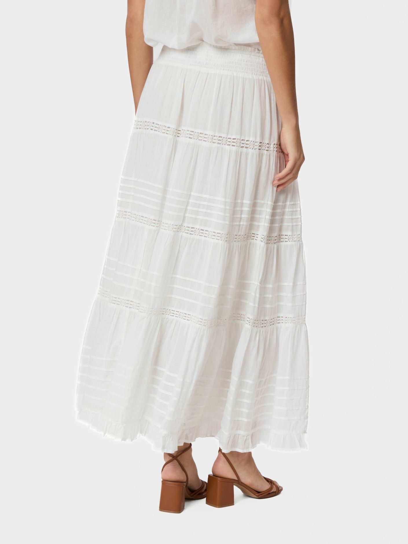 Maxikjol i bomull voile med dekoration i tejp och smockmidja, fodrad med bomull. Perfekt för vardag såväl som för semestern.