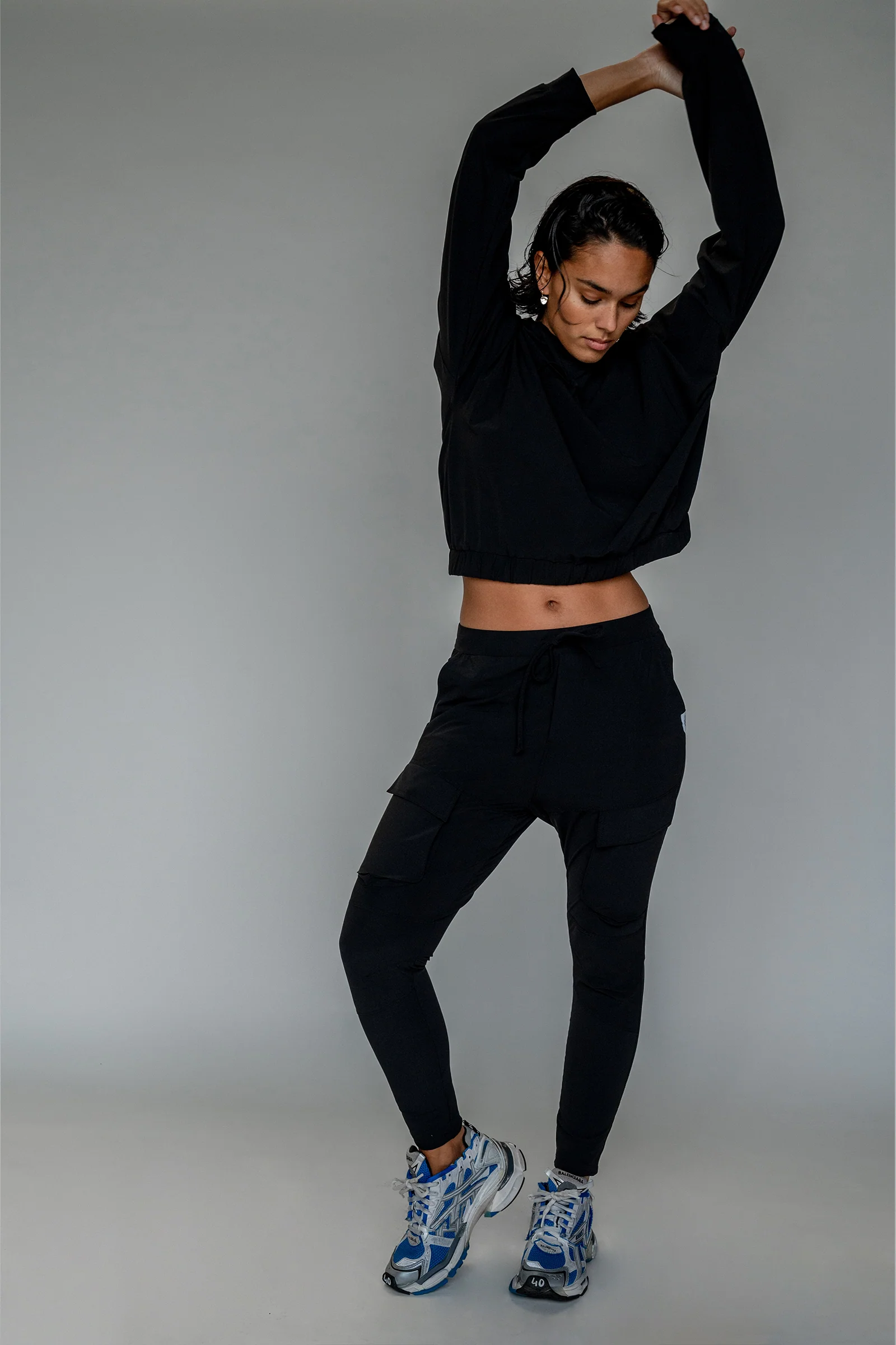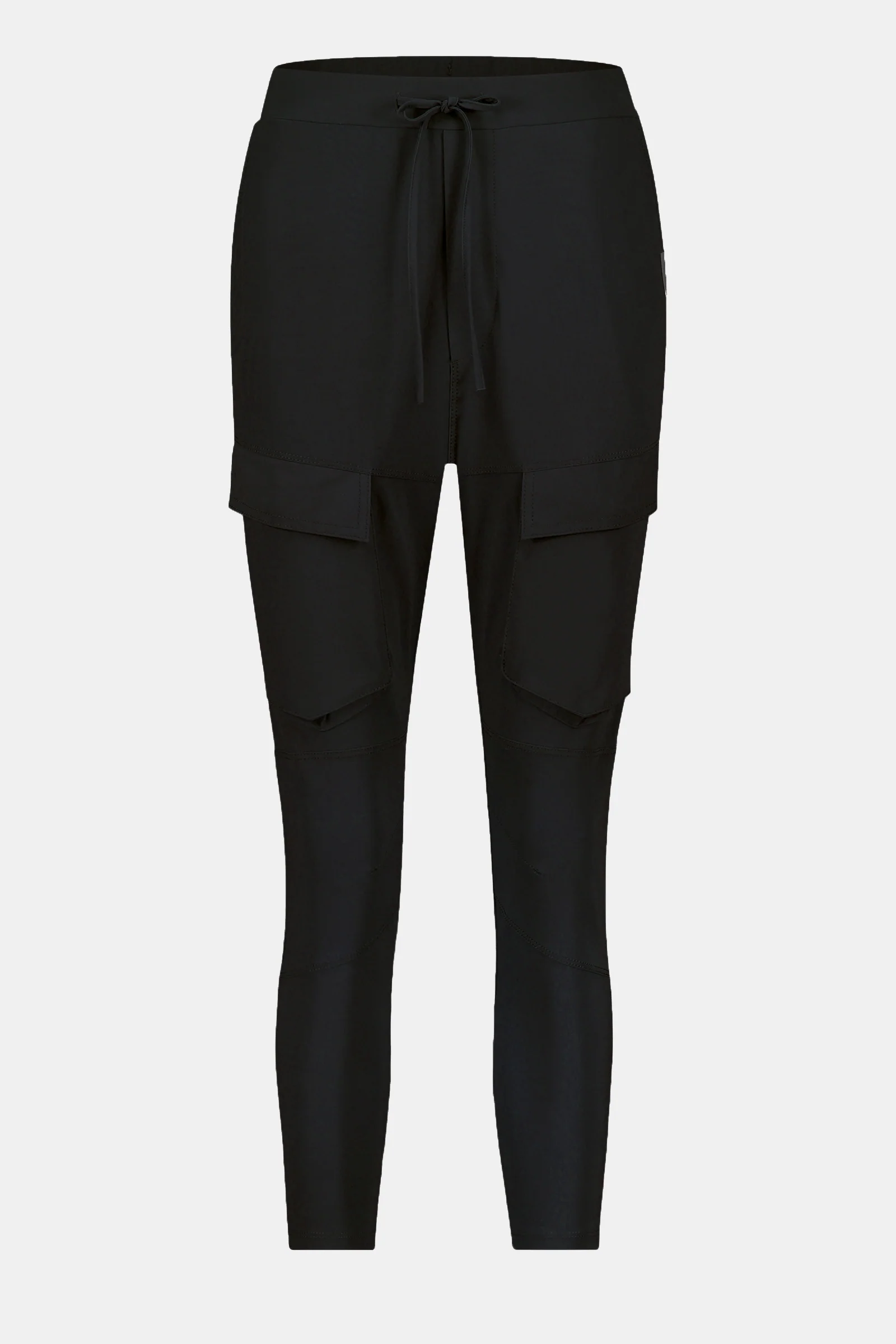 Byxor i sportig look tillverkade av mjukt stretchtyg. Detta plagg har fickor med lock framtill, bakfickor och dragsko i midjan.